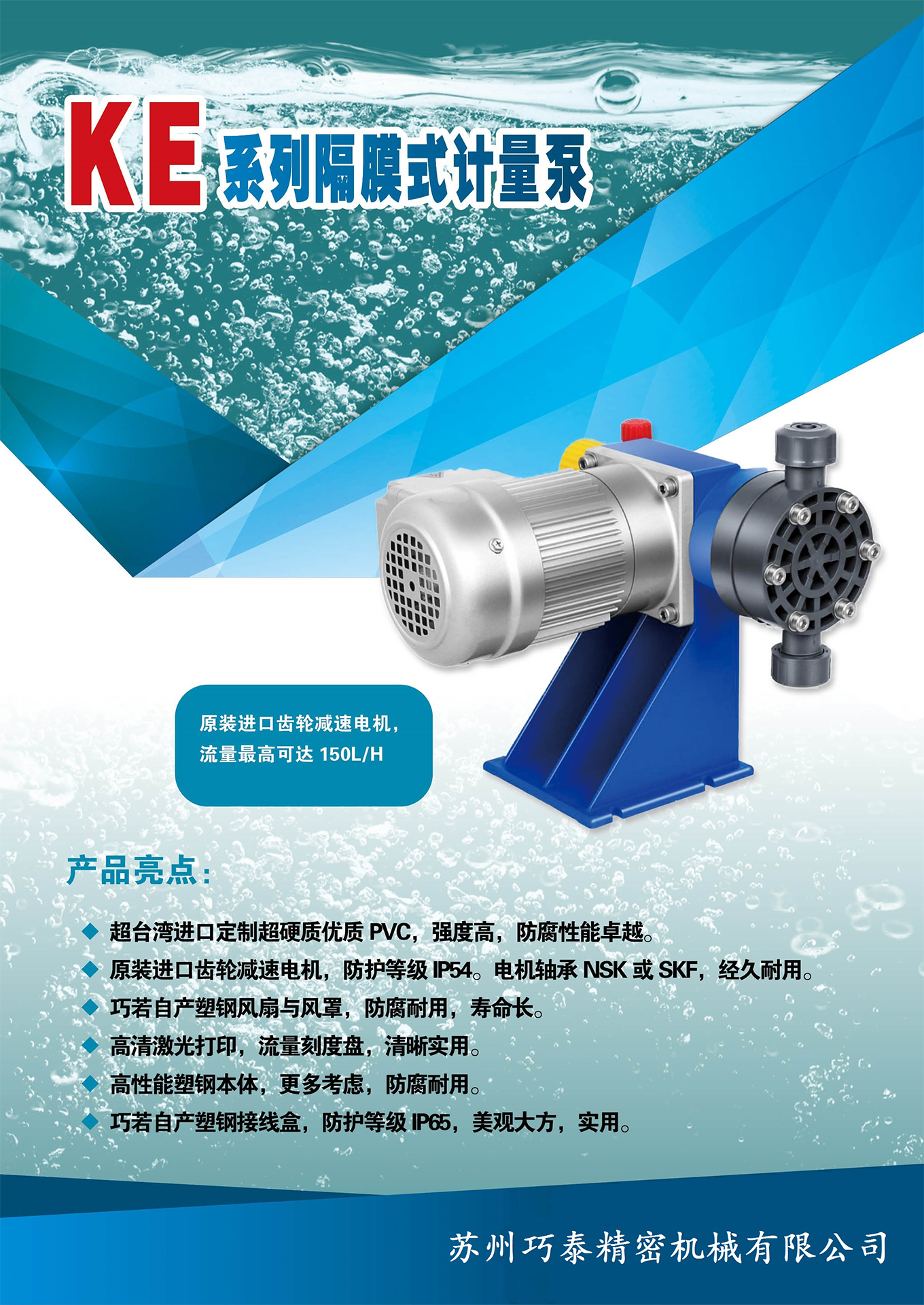 工作條件: 驅動方式:電機驅動,流量可達150L/H 工作條件:室內/室外 控制方式:手動方式控制調節 環境溫度:-10℃~ +45℃ 介質溫度:PP 60℃,LCP 330℃ 電源:單相110V、220V電容啟動馬達;三相220V、380V感應馬達